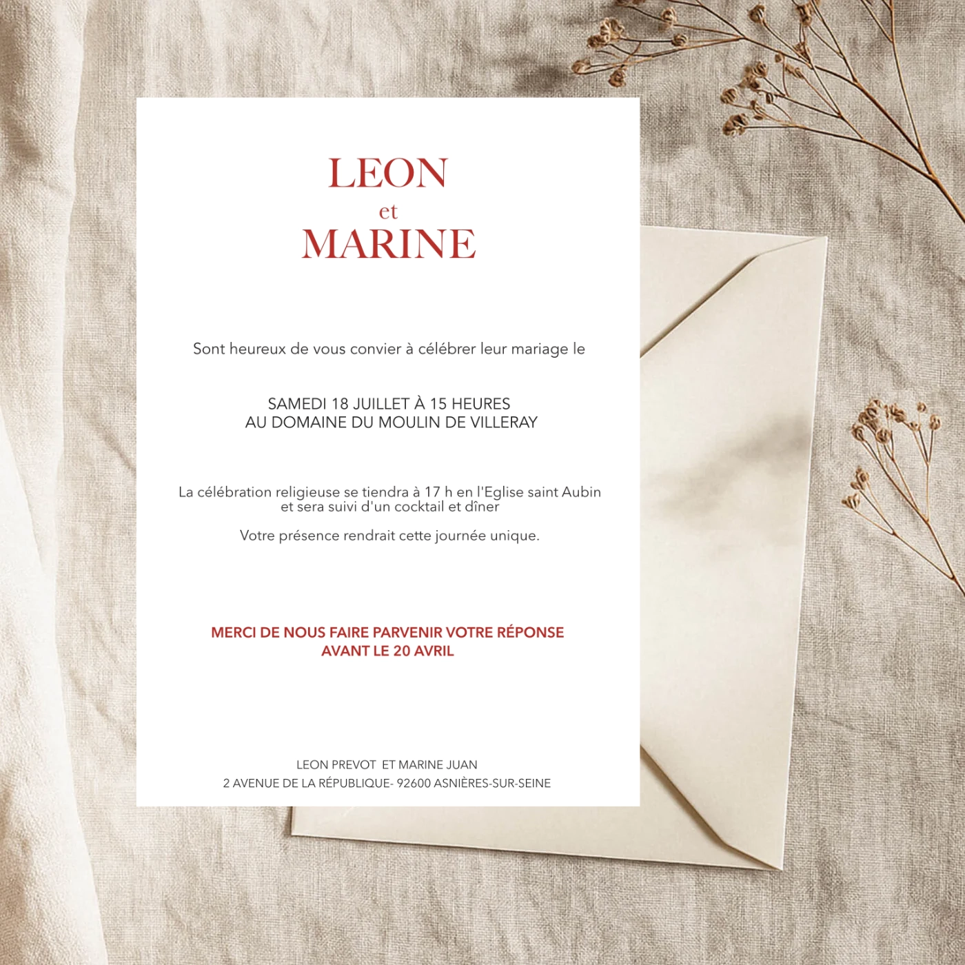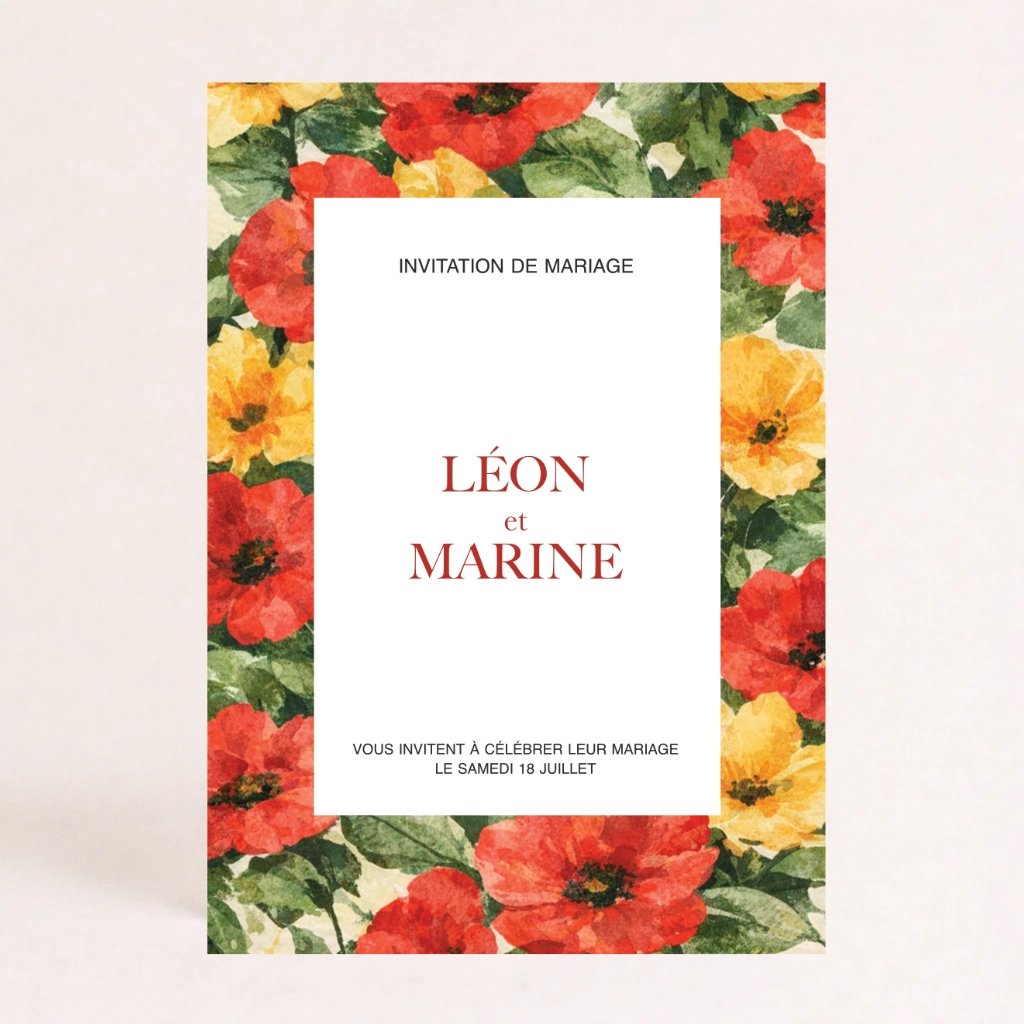Faire-part qui incarne l’élégance avec l’harmonie des fleurs et la chaleur des couleurs vives.