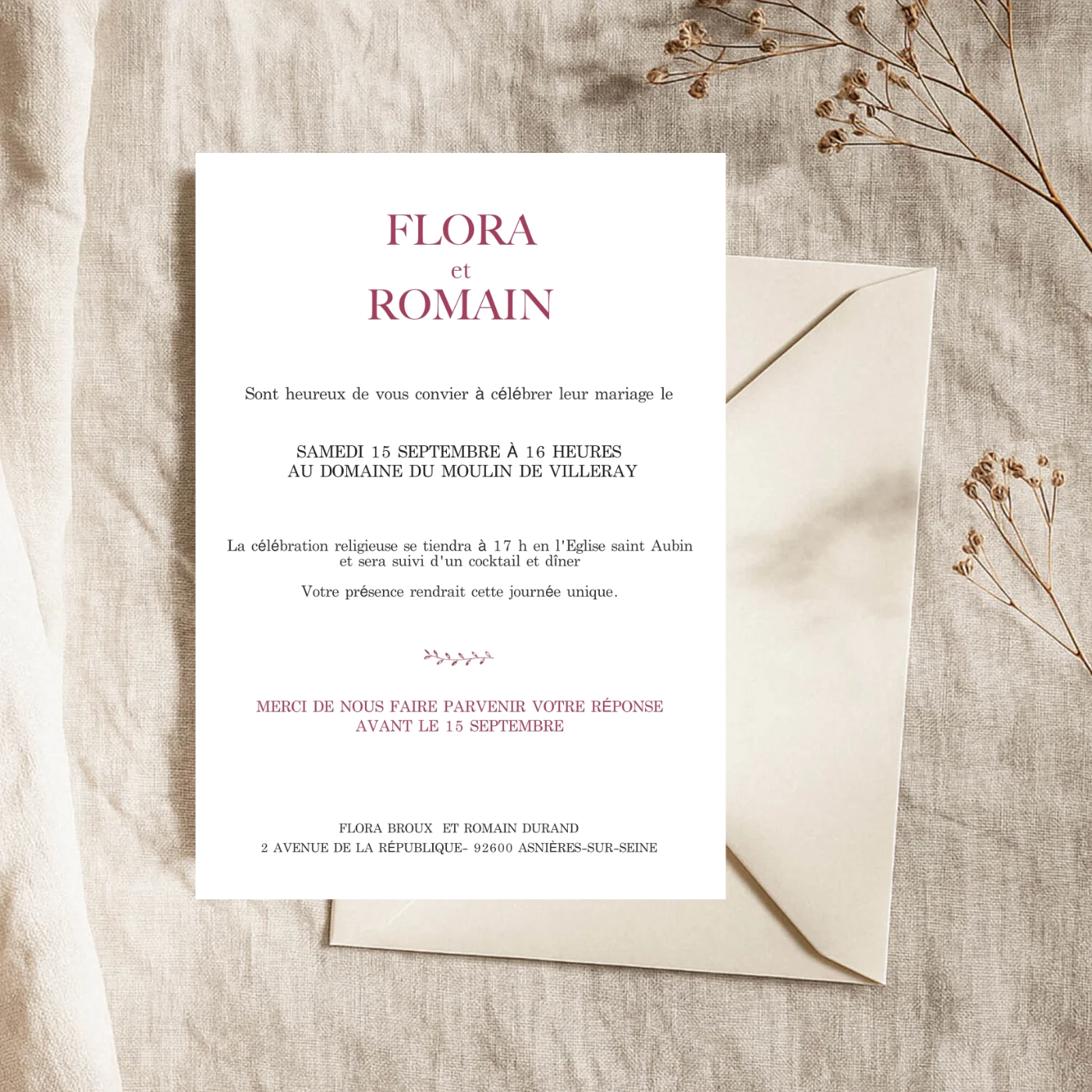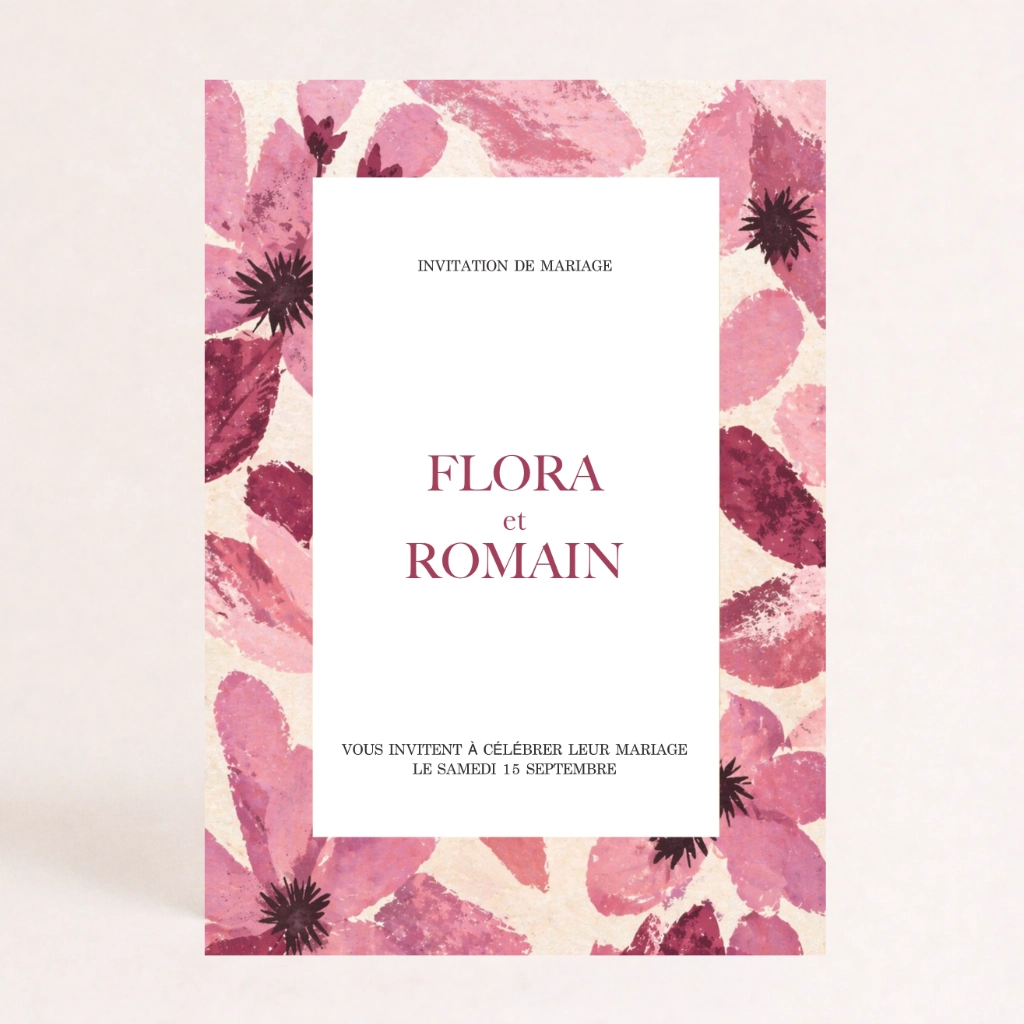 Faire-part au style fleuri et romantique, la couleur rose apporte une touche d’intensité à la création.