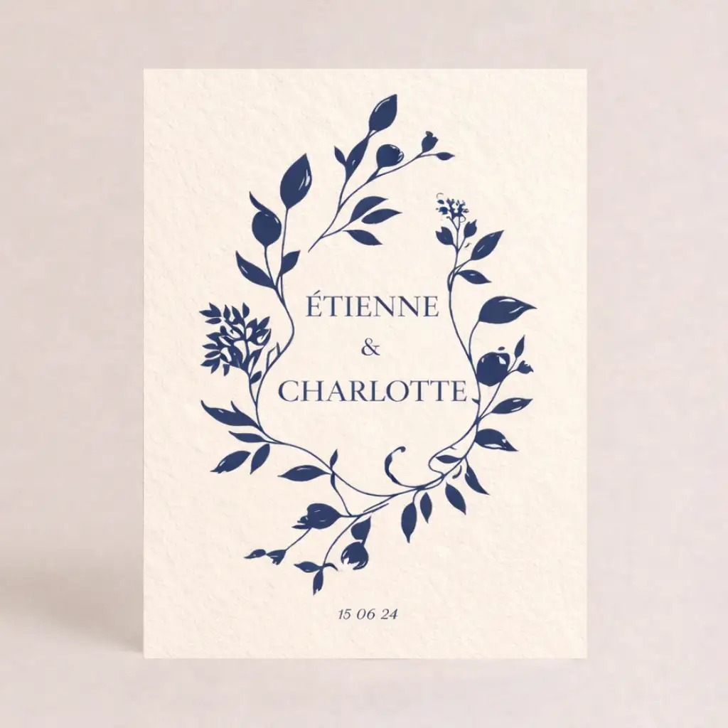 Ce faire-part représentant un parcours de feuillages bleus. Le design nous immisce dans une ambiance poétique. Une création originale pour annoncer votre moment.