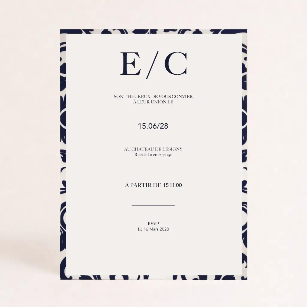 Faire-part simple volet caractérisé par une découpe rectangulaire. L'ensemble est personnalisable avec les détails de votre évènement.