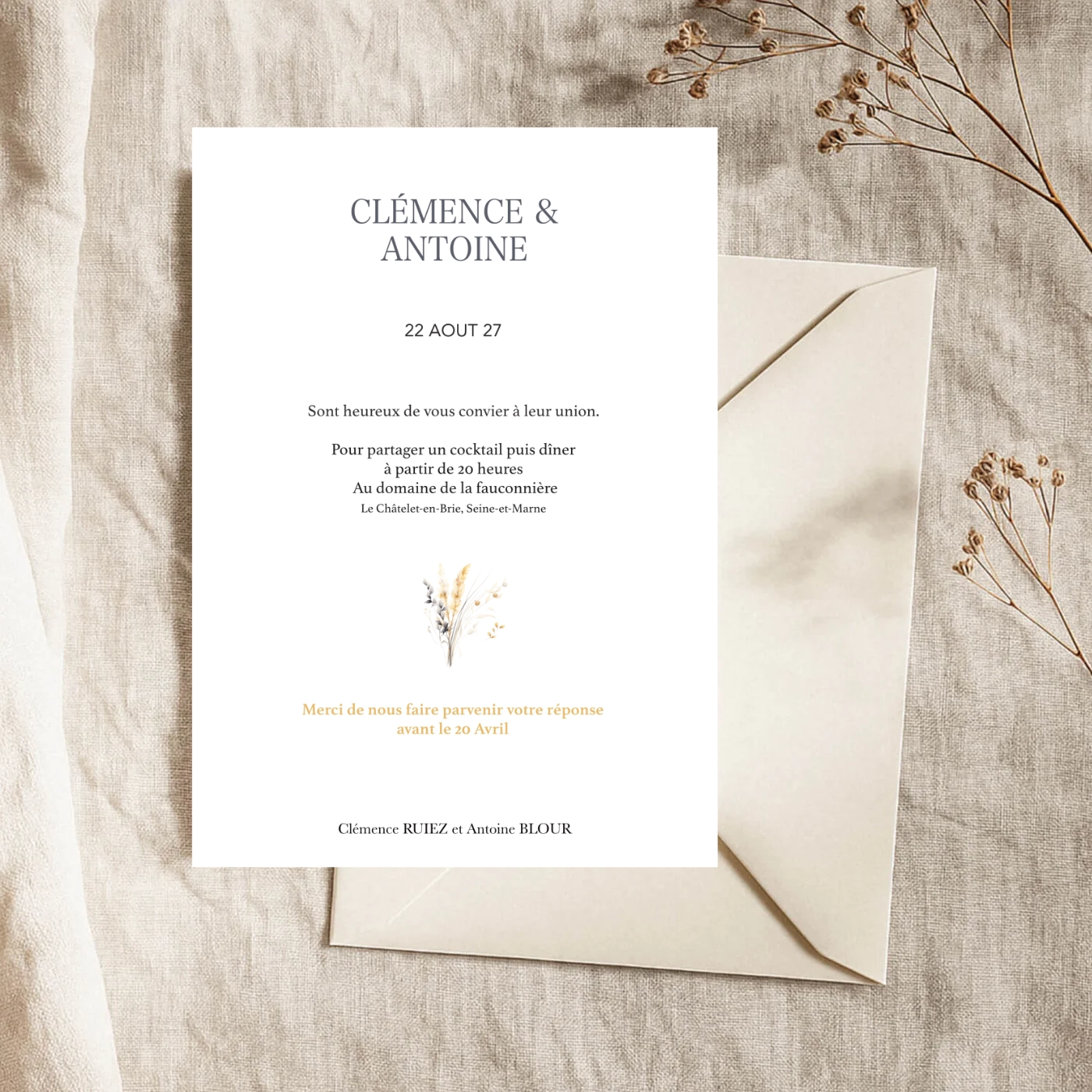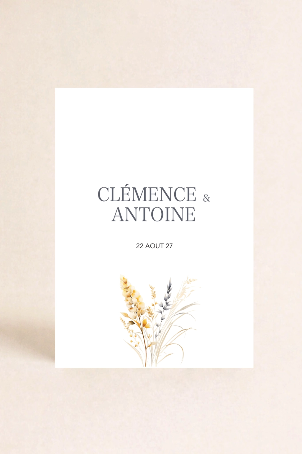 Inspirée par la beauté de la saison chaude et la richesse du monde végétal, ce faire-part annonce votre moment dans une ambiance florale. Son design unique, créé ainsi une carte à la fois délicate et intemporelle.