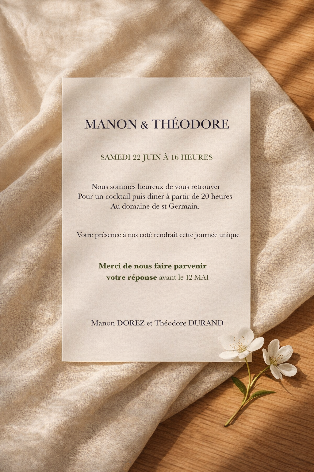 Faire-part double volet caractérisé par une découpe classique. L'ensemble est personnalisable avec les détails de votre évènement.