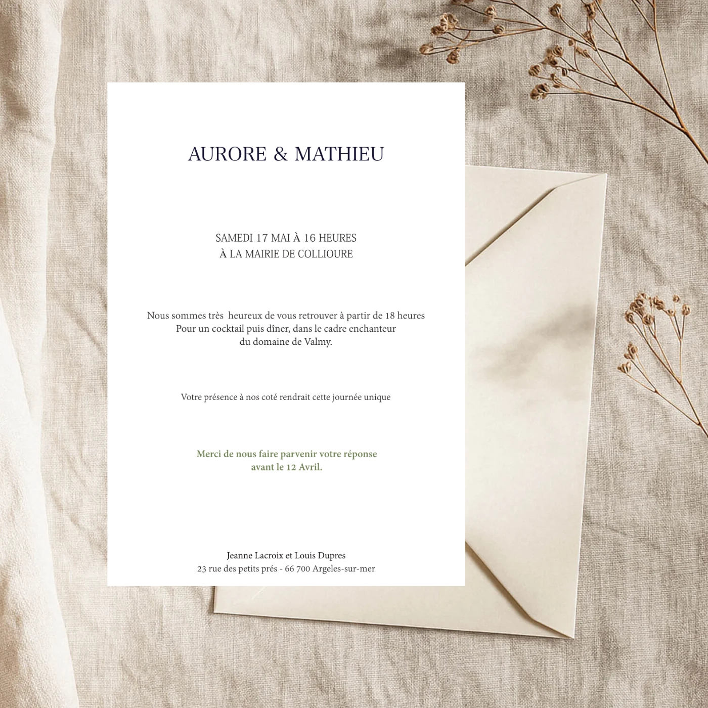 Faites chanter les cigales dans votre annonce avec le faire-part Lavande. Son design et sa typographie sont colorés et raffinés, cette invitation est le beau reflet de votre union.