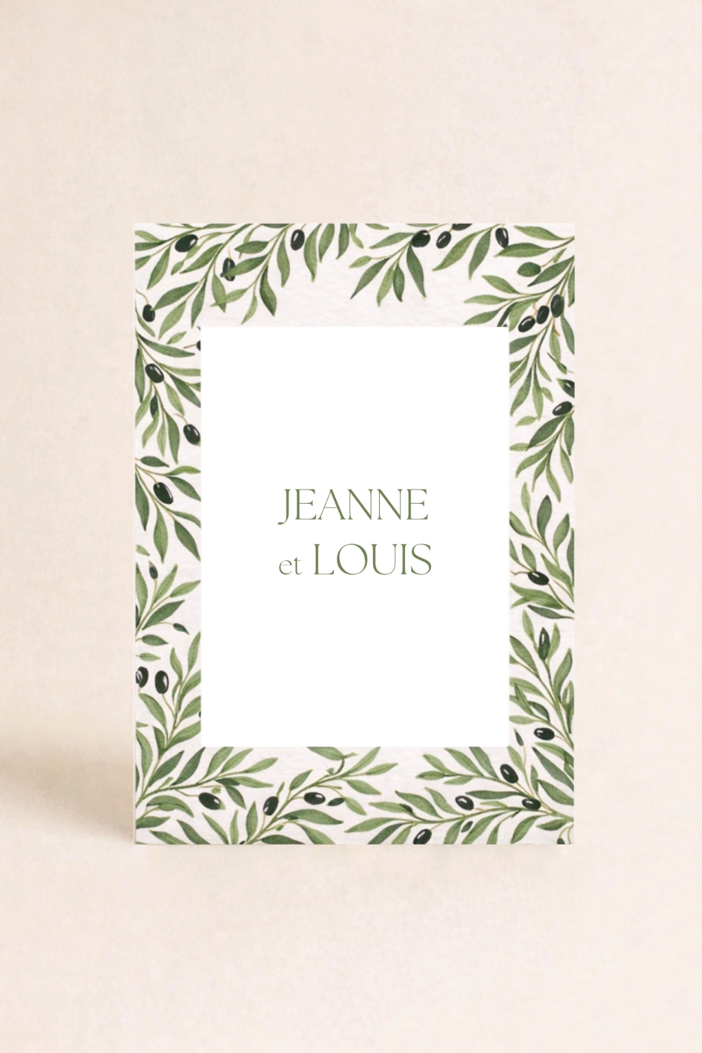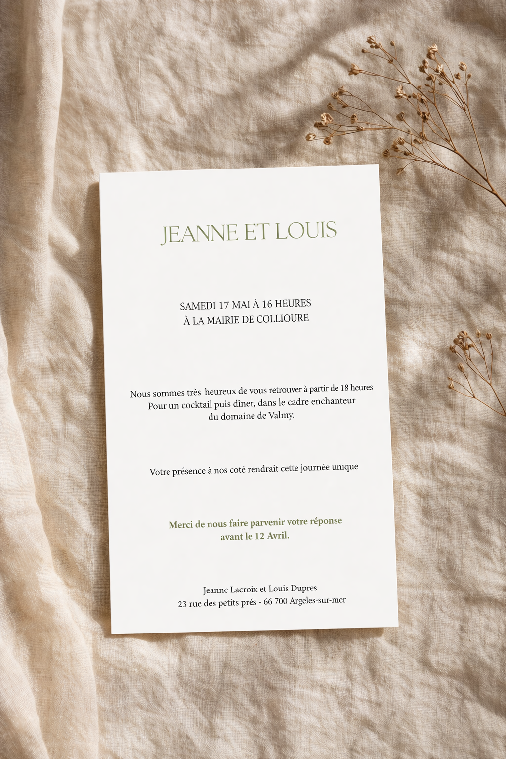 Faire-part double volet caractérisé par une découpe classique. L'ensemble est personnalisable avec les détails de votre évènement.