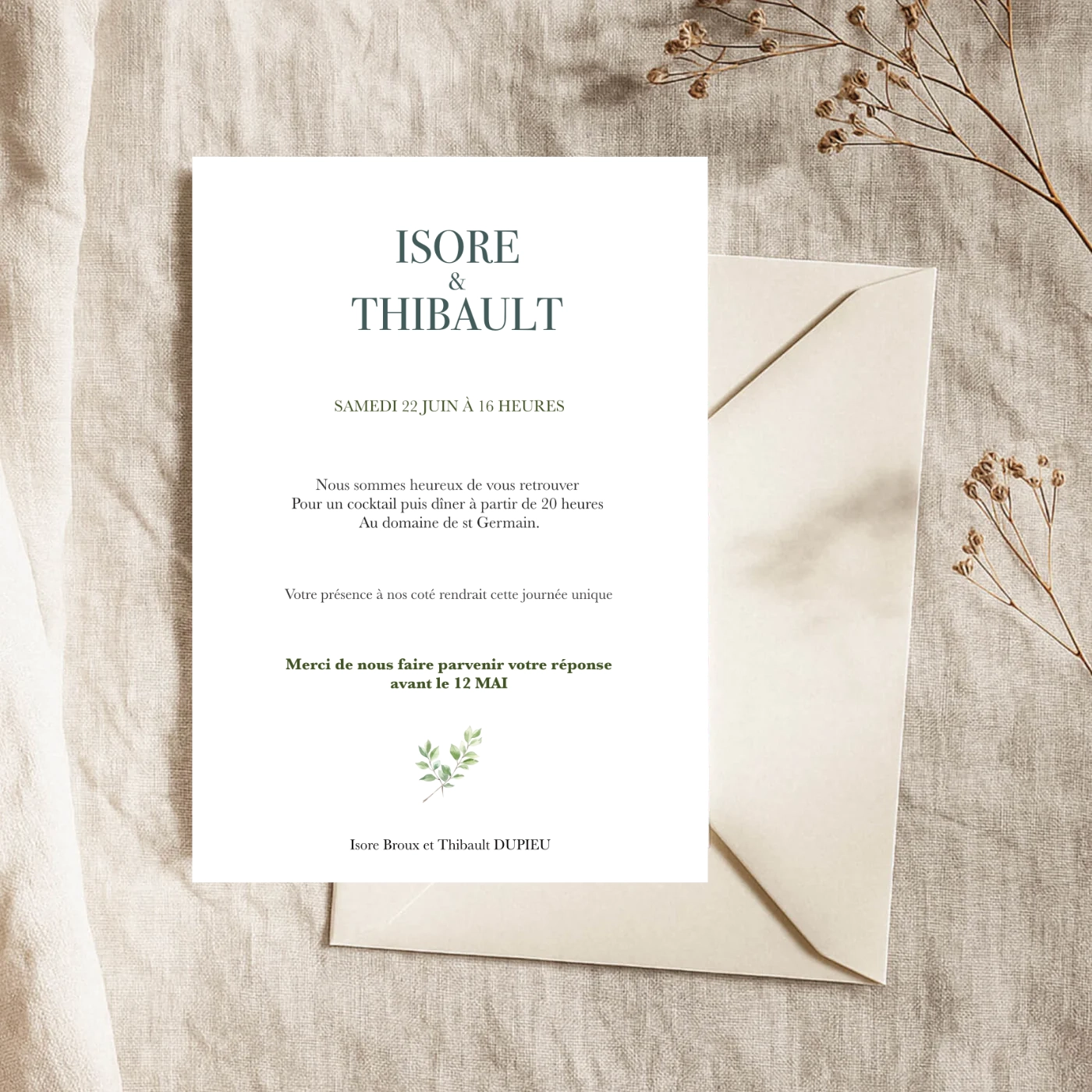 Ce faire-part est inspiré du monde végétal. Les finitions sont soignées pour un design à la fois classique et contemporain.